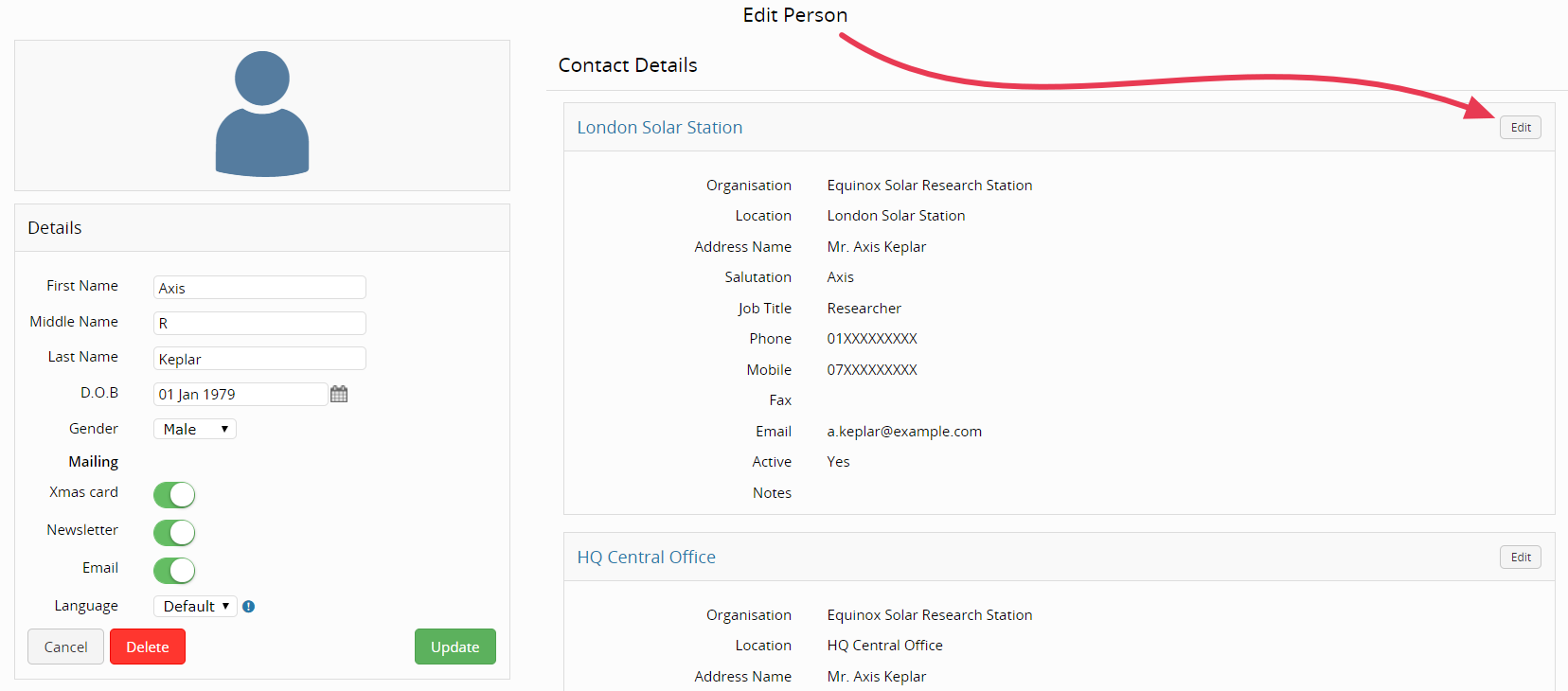 - The right of the screen lists the ‘Contact Details’ of each Location the Person is linked to