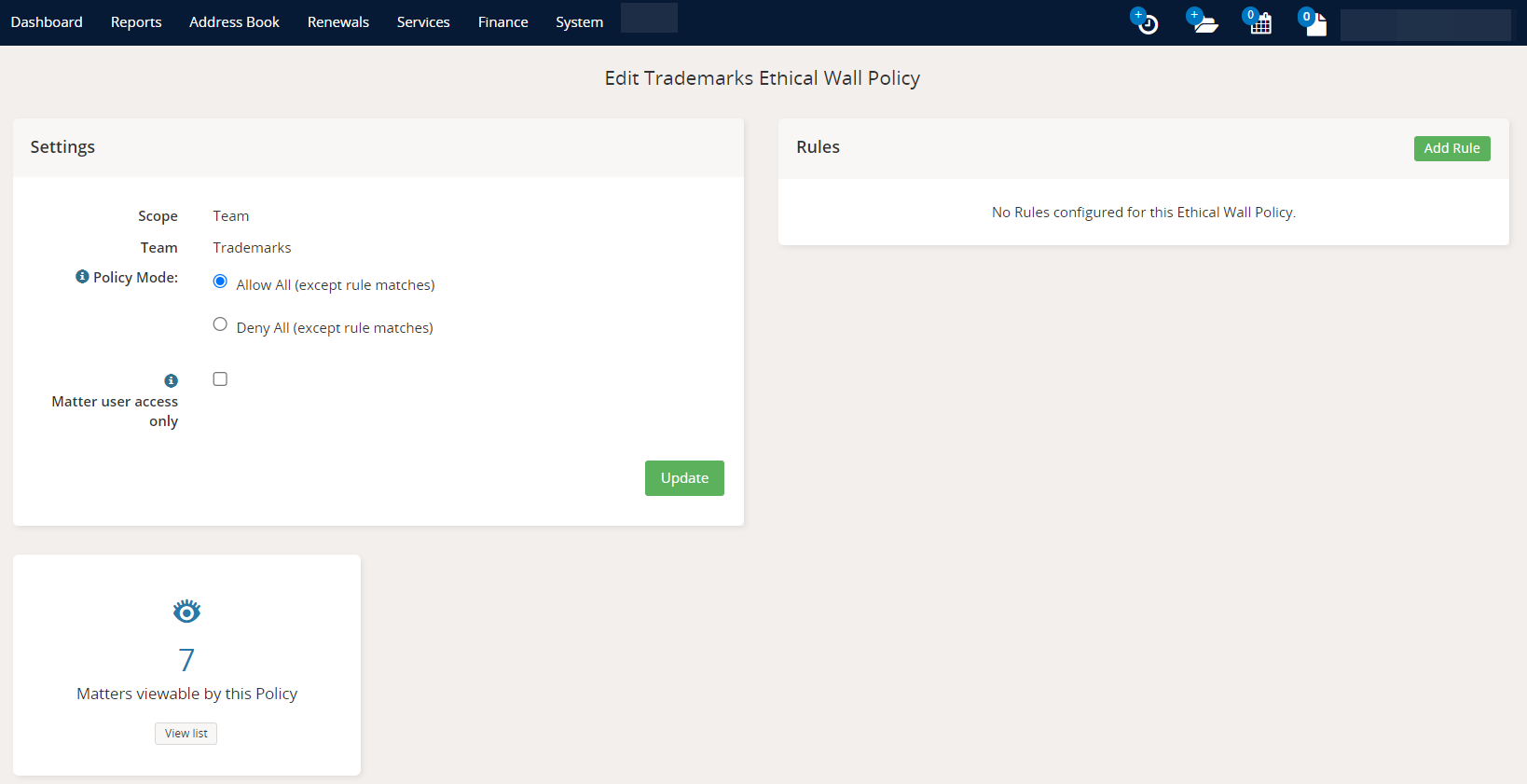 To view or manage Ethical Walls, a user must have the "System Ethical Walls Management" permission set to "Read" or above. For more information on system user permissions, please see the article System Permissions