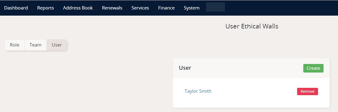 2. On the Ethical Walls Management page, under User select Create.