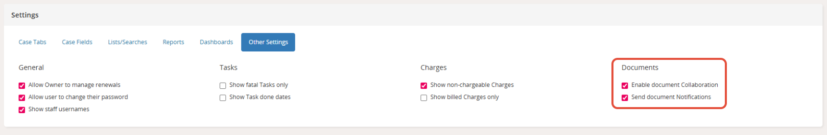 Here are two checkboxes; 'Enable Document Collaboration' and 'Send Document Notifications' (circled in red above).