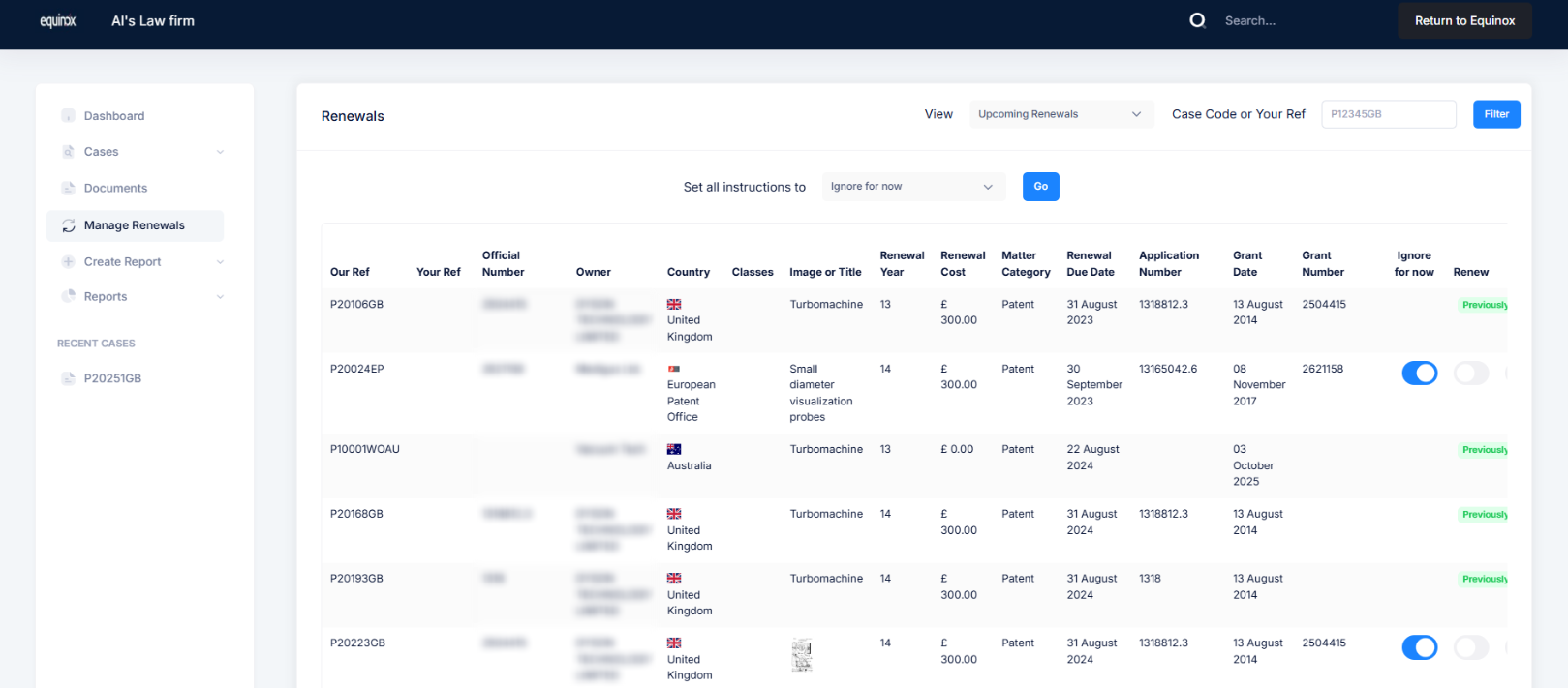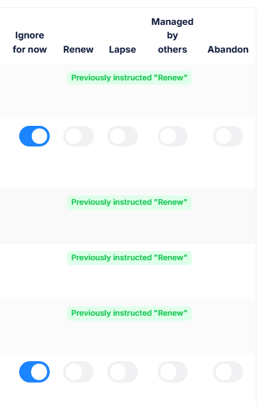 If we look more closely, you can see that there are 'switch' buttons, which allow for the renewal of individual cases, as well as an indication if a renewal has been previously instructed: