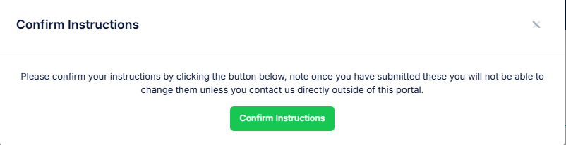 Once the changes have been made, and the client proceeds with confirming instructions, they will be given a pop-up asking them to confirm again before proceeding, and letting them know the only way to reverse action taken is to contact you directly outside of the portal: